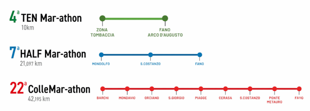 Si sviluppa con la partenza da Mondolfo, uno dei borghi più belli d’Italia, tocca San Costanzo, storica città sostenitrice e spettatrice di tutte le edizioni della ColleMar-athon, attraversa Ponte Metauro ed arriva all’imponente Arco d’Augusto di Fano.